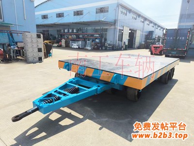 45吨重型平板拖车 无动力牵引全挂拖车铺橡胶板南工车辆长期非标订制,本拖车载重大,成本低,使用寿命长等特点。这类平板拖车常用于冶金、模具、机械等重型产品的中转运输,一般采用压配式实心胎.载重大,免维护。