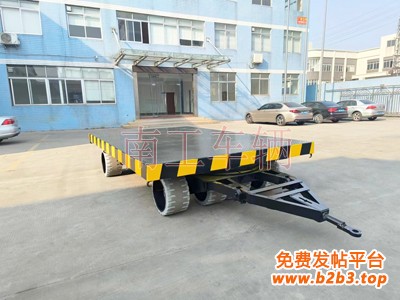 30吨重型平板拖车,叉车牵引重型工具拖车南工车辆长期非标订制,平板拖车载重大,成本低,使用寿命长,用于主要用于工厂、港口、码头、仓库、花园等场区内大宗货物周转运输。