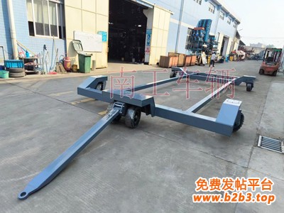 2、拖车配4个18*7-8实心轮胎, 单轮承载2.3T,前车前部两轮与牵引架链接实现转向引导作用,两侧两个轮胎为万向轮起到平衡与辅助承载作用,中部配置两个18*7-8轮胎,万向轮起到平衡与辅助承载作用,后部为单桥机构,配两个18*7-8轮胎,单载2.3T;