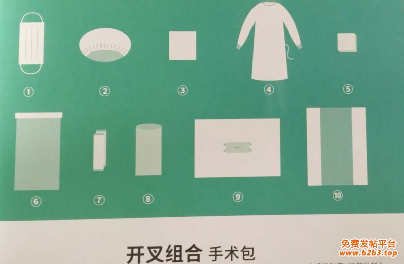 手术包配置:一次性使用医用口罩1个、一次性使用帽1个、擦手巾(40*38cm)8块、一次性使用手术衣3件、纱布块10块、器械盘套1条、备胶料(10*50cm)1条、医用防护罩(透明袋)1块、一次性使用手术洞巾1条、一次性使用包布1条