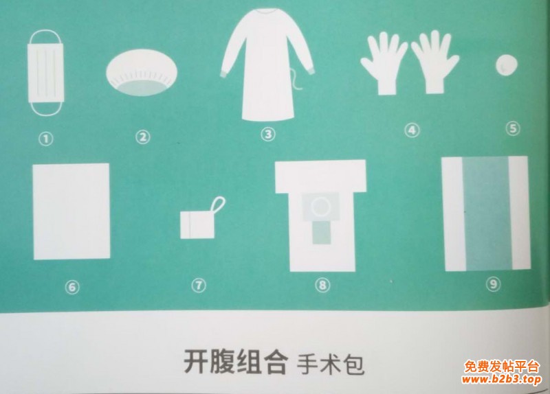 手术包配置:一次性使用医用口罩5个、一次性使用帽5个、医用一次性防护服5件条、手套5双、医用棉球10个、医用垫单2条、腹部垫单(30*30cm)10条、剖腹产单(180/245*260cm)1条、一次性使用包布1条。