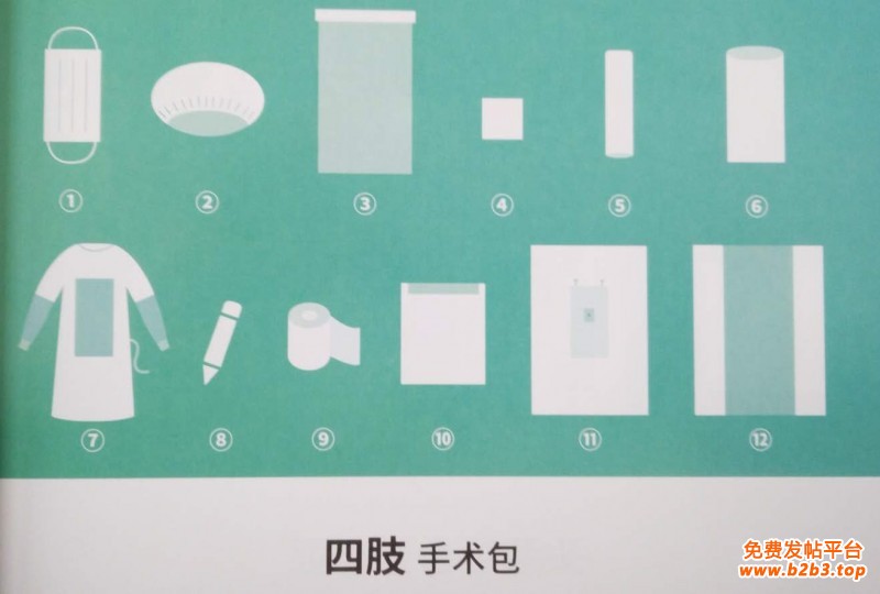 手术包配置:一次性使用医用口罩1个、一次性使用帽1个、器械盘套1条、擦手巾(40*40cm)2块、软质胶套1个、一次性使用手术衣(加强型)2件、医用记号笔1支、弹性绷带1卷、边单4条、四肢单1条、一次性使用包布1条。