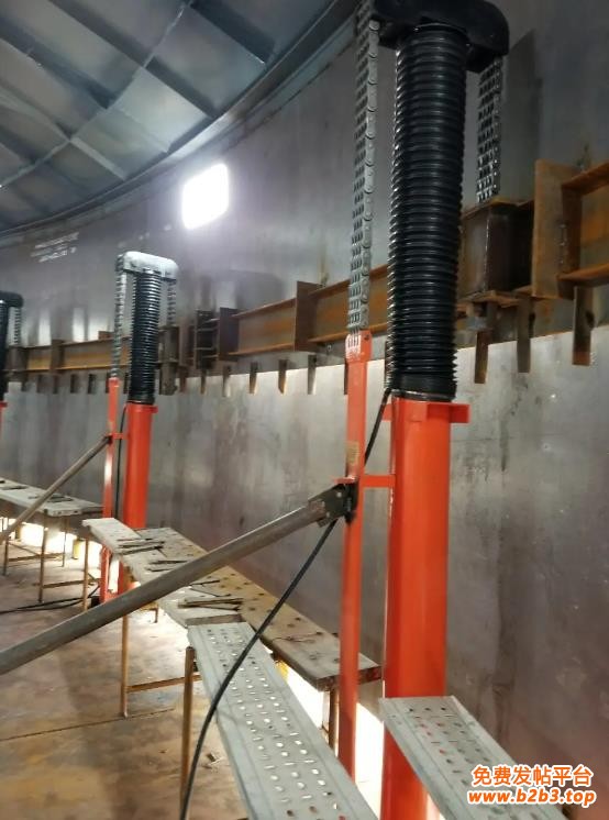 YB-60型液压泵站提升原理利用液压提升装置(成套设备)均布于储罐内壁圆周处,先提升罐顶及罐体的上层(层)壁板,然后逐层组焊罐体的壁板。采用自锁式液压千斤顶和提升架、提升杆组成的液压提升机,当液压千斤顶进油时,通过其上卡头卡紧并举起提升杆和胀圈,从而带动罐体(包括罐顶)向上提升;当千斤顶回油时,其上卡头随活塞杆回程,此时其下卡头自动卡紧提升杆不会下滑,千斤顶如此反复运动使提升杆带着罐体不断上升,直到预定的高度(空出下一层板的高度)。当下一层壁板对接组焊后,打开液压千斤顶的上、下松卡装置,松开上下卡头将提升杆以及胀圈下降到下一层壁板下部胀紧、焊好传力筋板,再进行提升。如此反复,使已组焊好的罐体上升,直到后一层壁板组焊完成,从而将整个储罐安装完哔。