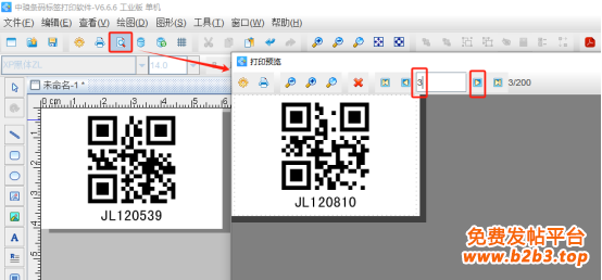 5. 点击软件顶部的“打印预览”按钮,翻页查看批量生成的二维码标签,预览无误就可以直接连接打印机打印出来了。