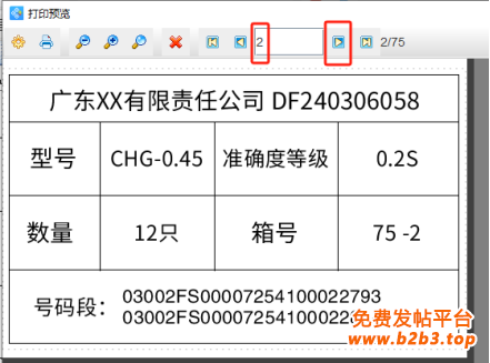 6.制作完成之后,点击软件顶部的“打印”按钮,在打开的窗口中设置数据量为75,开始页码为1,点击结束页码后面的“尾页”,然后点击下面的“预览”按钮,翻页查看批量生成的产品外包装箱标签,预览无误就可以直接连接打印机打印出来了。